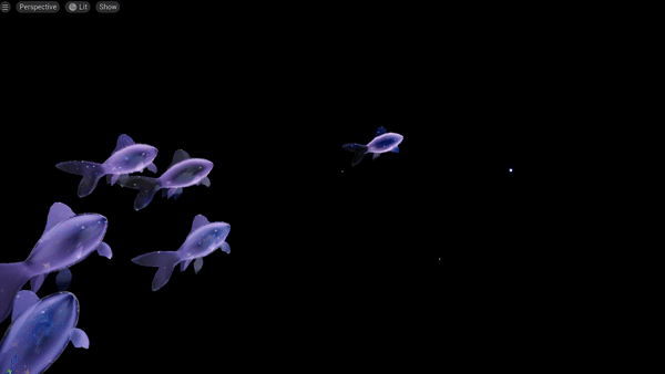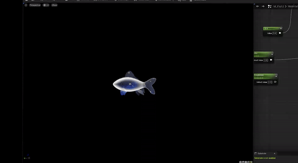 Flapping Animation: I used a gradient map to control UV coordinates to achieve flapping animation. The result is applied to the World Position Offset node to animate the fish's body/