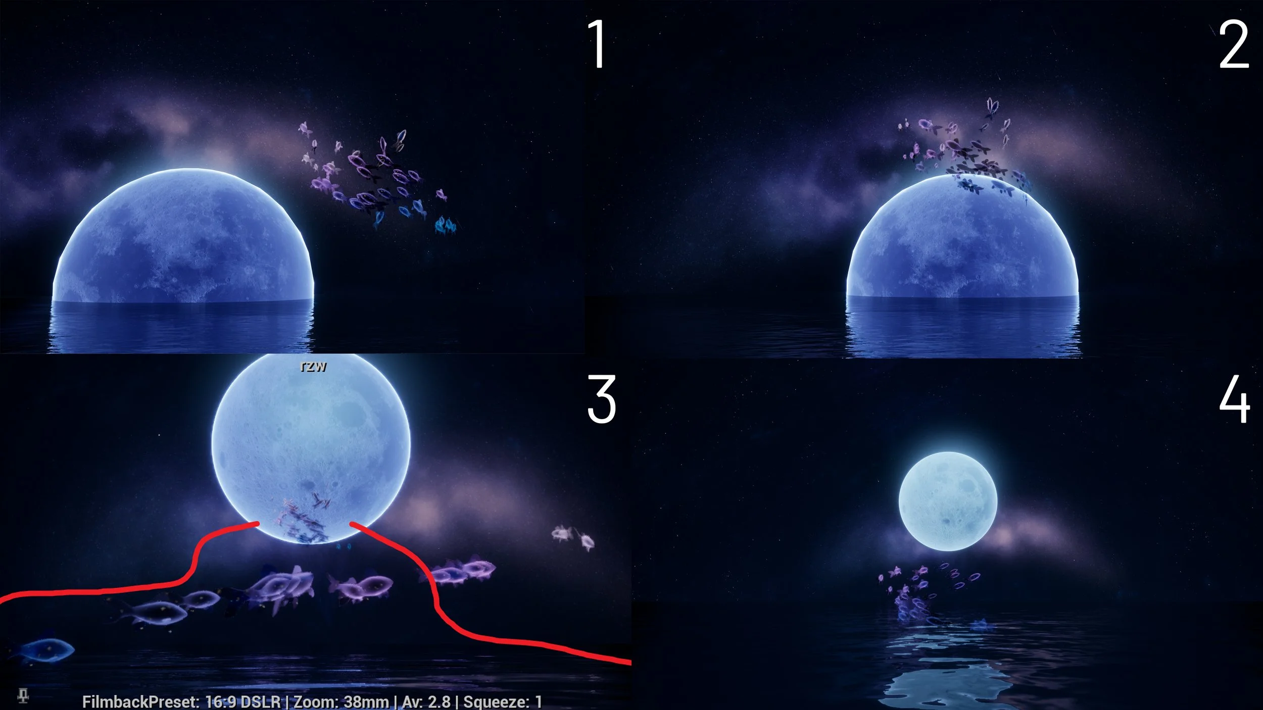 I wanted the fish flock to ascend from the sea to the moon in a captivating spiral motion. To achieve this effect, I applied a vortex force in Niagara System to produce this spiraling effect.