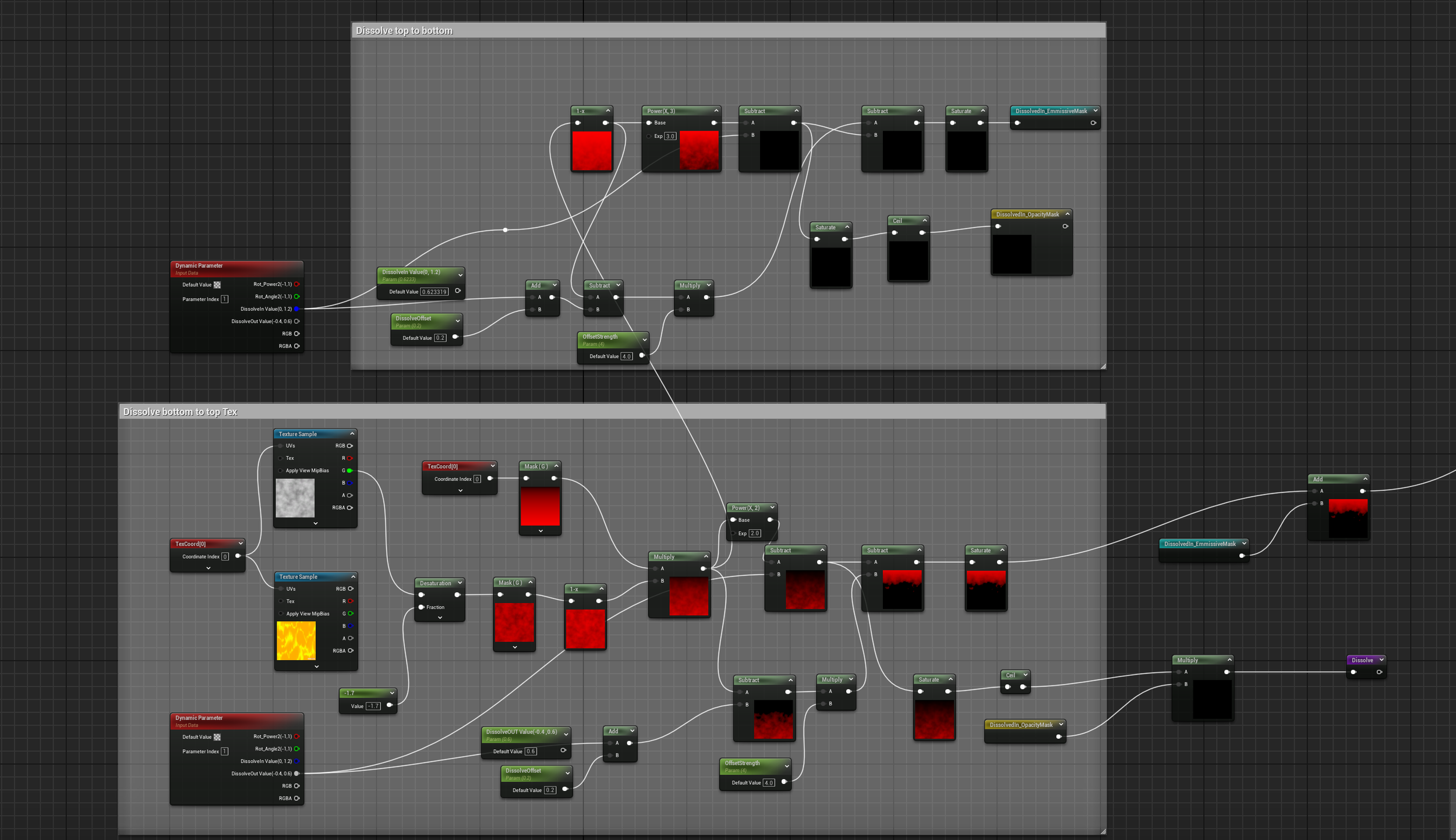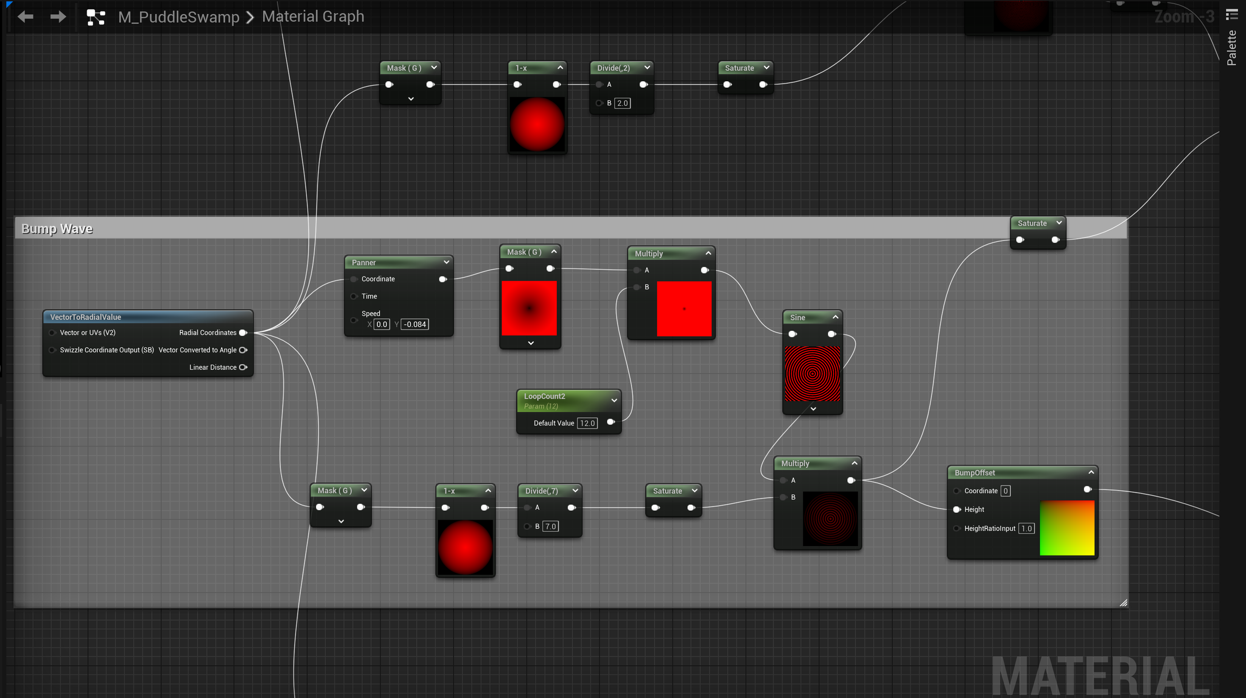 When the flower blooms and the small flowers appear, a puddle texture forms beneath them. To create the ripple effect, I used the Vector to Radial Value and Sine nodes to generate the ripple shape, and then applied Bump offset to animate the wave motion of the ripples.